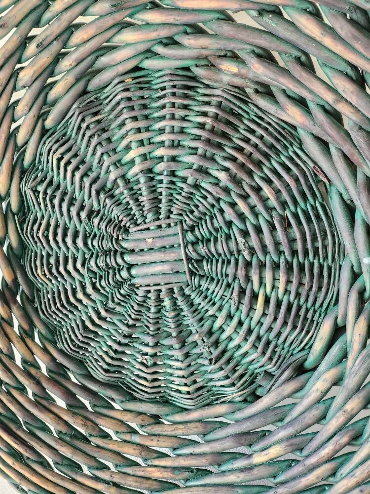 Beautifully woven shallow vine basket. This exceptionally large vintage basket is turquoise toned with an oversized vines and base - Great for flowers, holiday arrangement, or a unique wall wreath!